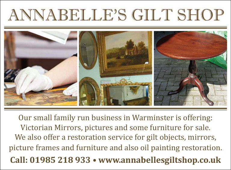 ADDRESS & CONTACT Address 3 Silver Street, Warminster GPS 1, 1 Telephone 01985 218 933 Email info@annabellesgiltshop.co.uk Web http://www.annabellesgiltshop.co.uk Social Media Facebook Twitter / X Instagram LinkedIn Youtube TikTok Pinterest IMAGE GALLERY OPENING TIMES