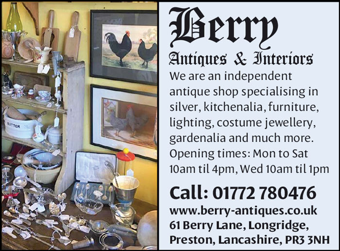 We at Berry Antiques & Interiors are an independent Antique Shop based in the small market town of Longridge near Preston. We specialise in a lot items so we are more than sure you will find something that you can treasure from silver and pottery to furniture and costume jewellery – we do it all! No matter if you looking for an antique or something more interesting and unusual, our collections are quite vast and caters for all tastes and budgets.