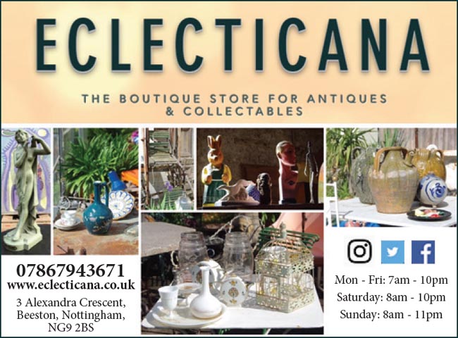ADDRESS & CONTACT Address 140 Derby Road, Nottingham, NG7 1LR GPS 1, 1 Telephone 0115 924 3226 Email trak.e.smith22@hotmail.co.uk Web http://www.eclecticana.co.uk Social Media Facebook Twitter / X Instagram LinkedIn Youtube TikTok Pinterest IMAGE GALLERY OPENING TIMES