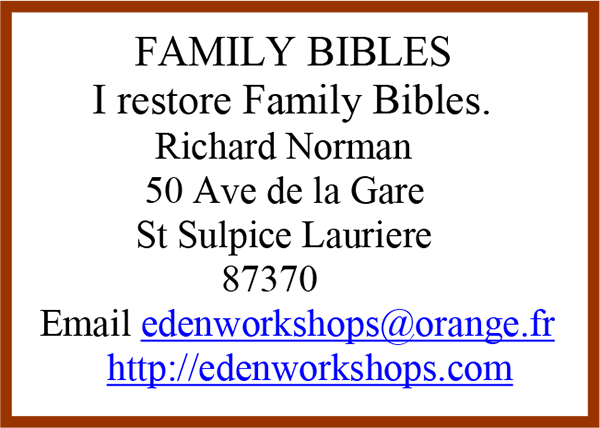 Here in our workshops in southwest France, we continue to specialise in family Bible repair and restoration of sacred texts, we send and receive books by secure delivery to Europe and the USA.