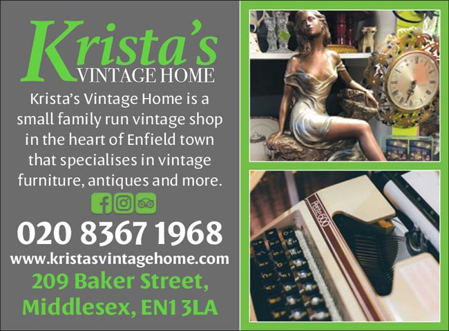 ADDRESS & CONTACT Address 209 Bakers Street, Enfield, London. EN1 3LA GPS 1, 1 Telephone 0208 367 1968 Email kristasvintagehome@hotmail.com Web http://www.kristasvintagehome.com Social Media Facebook Twitter / X Instagram LinkedIn Youtube TikTok Pinterest IMAGE GALLERY OPENING TIMES