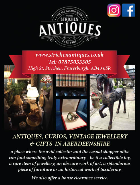 ADDRESS & CONTACT Address 54 High Street, Strichen, Fraserburgh GPS 1, 1 Telephone 07875 033 305 Email strichenantiques@gmail.com Web http://www.strichenantiques.co.uk Social Media Facebook Twitter / X Instagram LinkedIn Youtube TikTok Pinterest IMAGE GALLERY OPENING TIMES