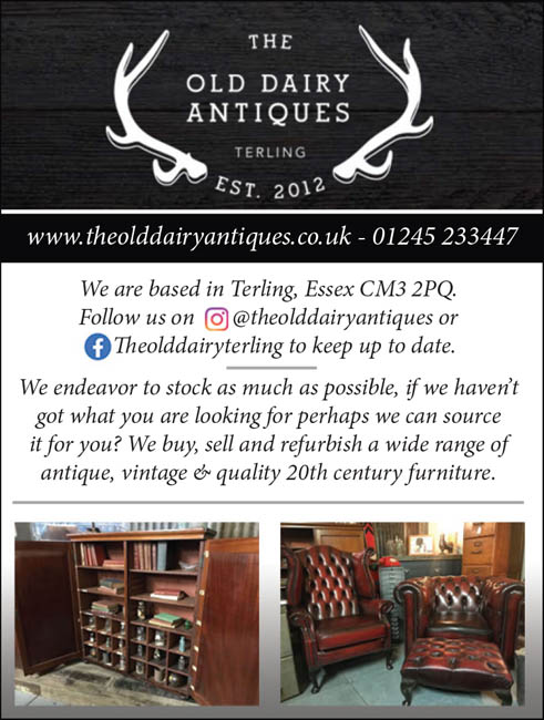 ADDRESS & CONTACT Address The Old Dairy, Church Road, Terling, Essex. CM3 2PQ GPS 1, 1 Telephone 01245 233 447 Email theolddairyterling@gmail.com Web http://www.theolddairyantiques.co.uk Social Media Facebook Twitter / X Instagram LinkedIn Youtube TikTok Pinterest IMAGE GALLERY OPENING TIMES