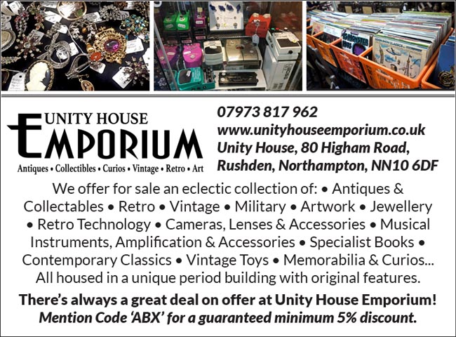 Unity House Emporium offers for sale an eclectic collection of Antiques, Collectibles, Retro, Vintage, Veteran, Ancient, Military, Artwork, Period Furniture, Contemporary Classics, Vinyl Records, Musical Instruments and equipment, Memorabilia & Curios and an extensive Military Books section… all housed in a unique period building with original features. There’s always a great deal on offer.